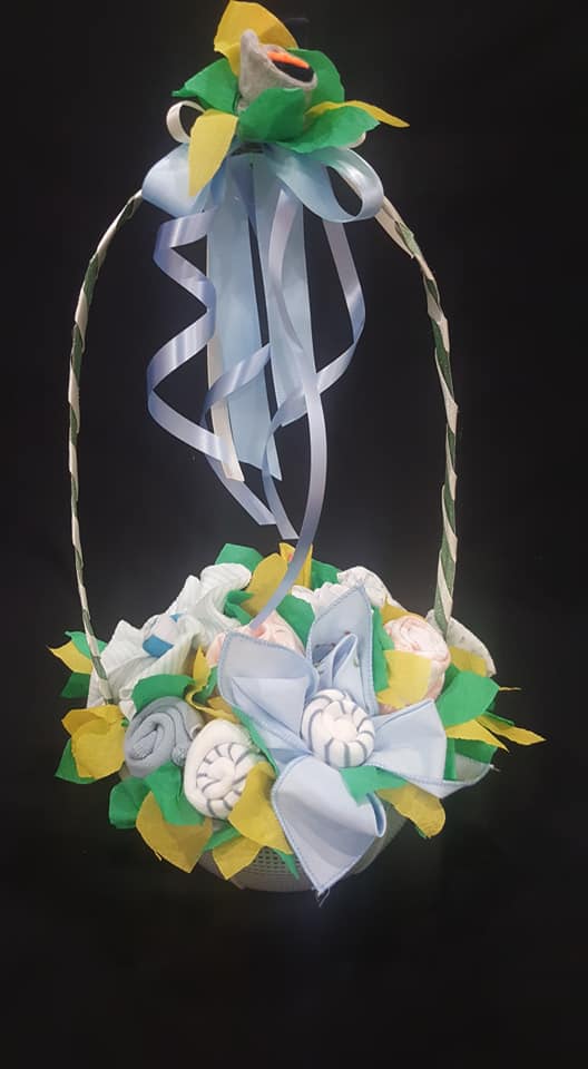 Spring, How about welcoming your little gem in a spring themed baby shower. Colourful basket of love made from baby accessories.