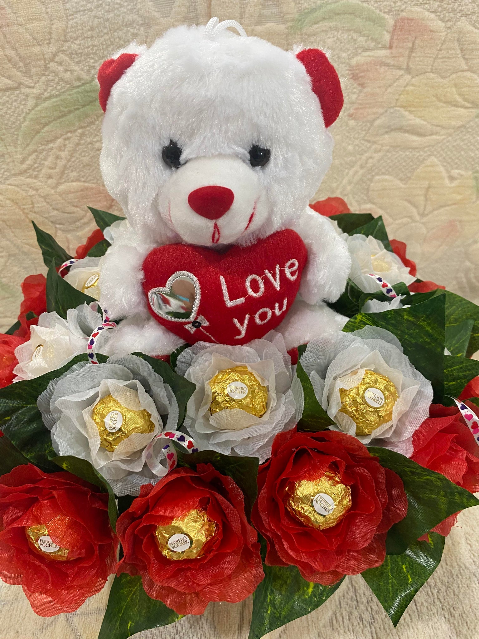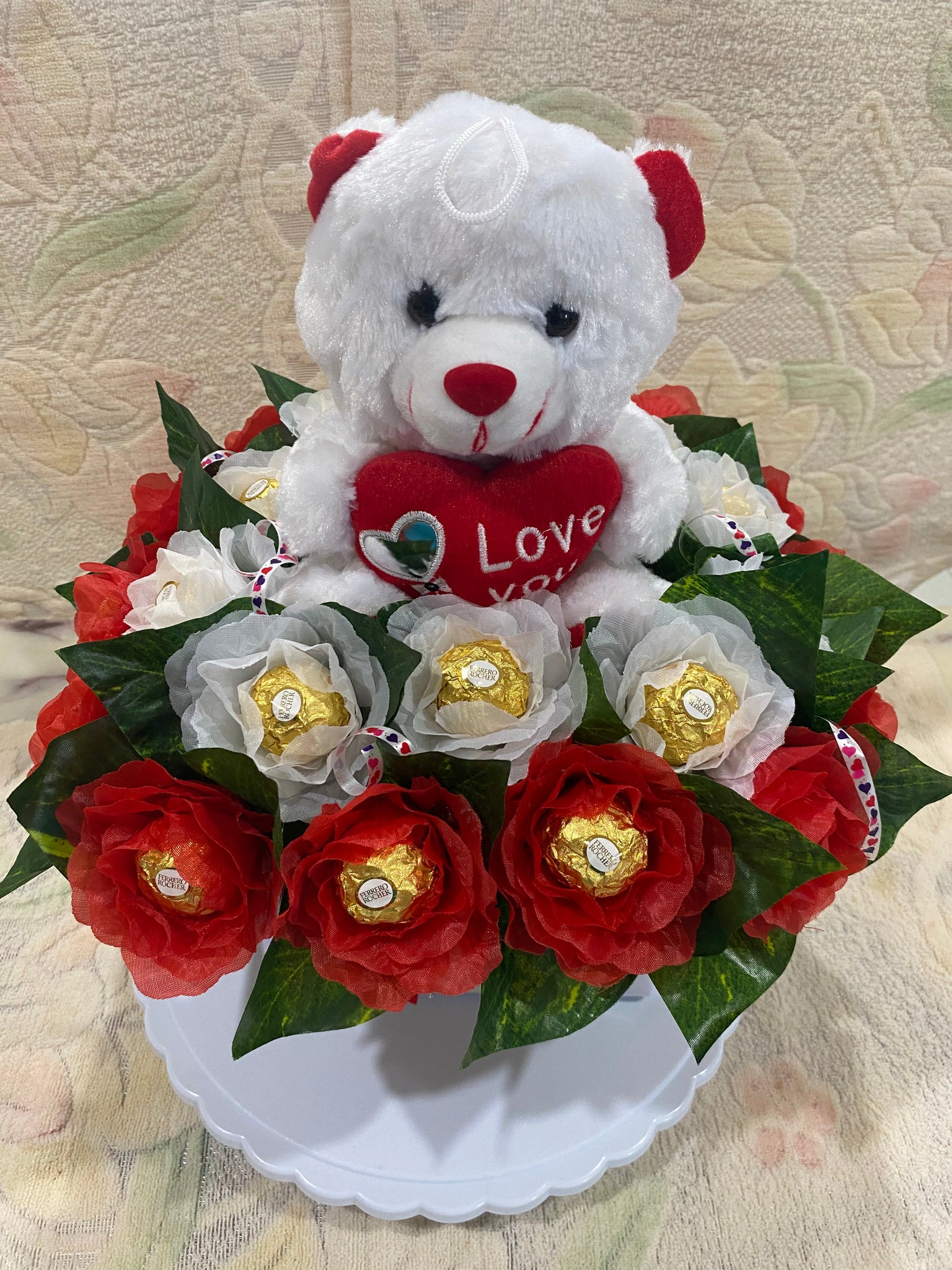 This adorable chocolate bouquet is made with 24 Ferrero Rocher Roses & a white Teddy Plush holding a “ Love You “ heart beautifully organised in a posey box.